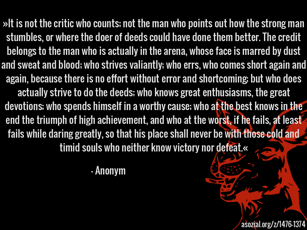 »It is not the critic who counts; not the man who points out how the strong man stumbles, or where the doer of deeds could have done them better. The credit belongs to the man who is actually in the arena, whose face is marred by dust and sweat and blood; who strives valiantly; who errs, who comes short again and again, because there is no effort without error and shortcoming; but who does actually strive to do the deeds; who knows great enthusiasms, the great devotions; who spends himself in a worthy cause; who at the best knows in the end the triumph of high achievement, and who at the worst, if he fails, at least fails while daring greatly, so that his place shall never be with those cold and timid souls who neither know victory nor defeat.« - Anonym