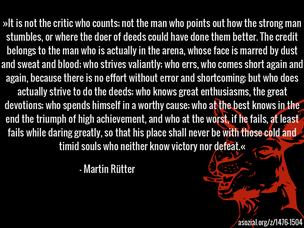 »It is not the critic who counts; not the man who points out how the strong man stumbles, or where the doer of deeds could have done them better. The credit belongs to the man who is actually in the arena, whose face is marred by dust and sweat and blood; who strives valiantly; who errs, who comes short again and again, because there is no effort without error and shortcoming; but who does actually strive to do the deeds; who knows great enthusiasms, the great devotions; who spends himself in a worthy cause; who at the best knows in the end the triumph of high achievement, and who at the worst, if he fails, at least fails while daring greatly, so that his place shall never be with those cold and timid souls who neither know victory nor defeat.« - Martin Rütter