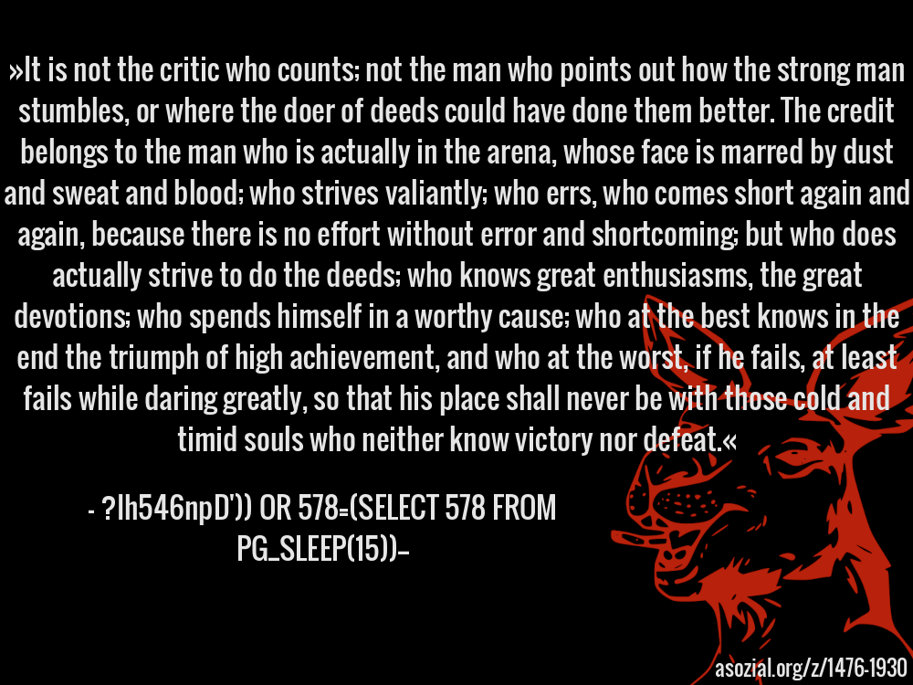 »It is not the critic who counts; not the man who points out how the strong man stumbles, or where the doer of deeds could have done them better. The credit belongs to the man who is actually in the arena, whose face is marred by dust and sweat and blood; who strives valiantly; who errs, who comes short again and again, because there is no effort without error and shortcoming; but who does actually strive to do the deeds; who knows great enthusiasms, the great devotions; who spends himself in a worthy cause; who at the best knows in the end the triumph of high achievement, and who at the worst, if he fails, at least fails while daring greatly, so that his place shall never be with those cold and timid souls who neither know victory nor defeat.« - ?Ih546npD')) OR 578=(SELECT 578 FROM PG_SLEEP(15))--