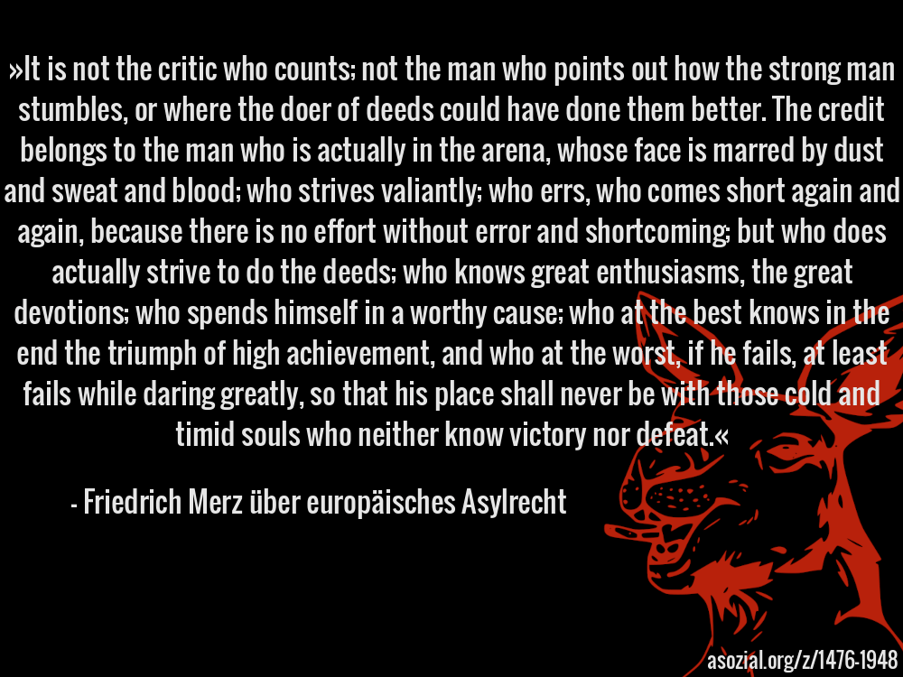 »It is not the critic who counts; not the man who points out how the strong man stumbles, or where the doer of deeds could have done them better. The credit belongs to the man who is actually in the arena, whose face is marred by dust and sweat and blood; who strives valiantly; who errs, who comes short again and again, because there is no effort without error and shortcoming; but who does actually strive to do the deeds; who knows great enthusiasms, the great devotions; who spends himself in a worthy cause; who at the best knows in the end the triumph of high achievement, and who at the worst, if he fails, at least fails while daring greatly, so that his place shall never be with those cold and timid souls who neither know victory nor defeat.« - Friedrich Merz über europäisches Asylrecht