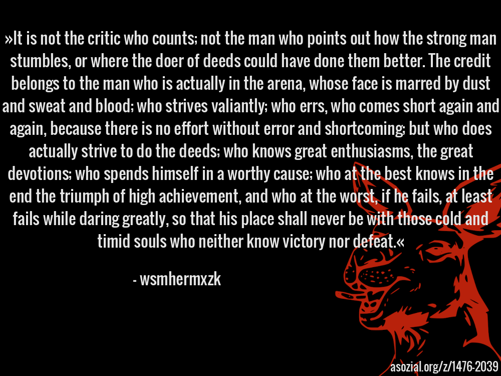 »It is not the critic who counts; not the man who points out how the strong man stumbles, or where the doer of deeds could have done them better. The credit belongs to the man who is actually in the arena, whose face is marred by dust and sweat and blood; who strives valiantly; who errs, who comes short again and again, because there is no effort without error and shortcoming; but who does actually strive to do the deeds; who knows great enthusiasms, the great devotions; who spends himself in a worthy cause; who at the best knows in the end the triumph of high achievement, and who at the worst, if he fails, at least fails while daring greatly, so that his place shall never be with those cold and timid souls who neither know victory nor defeat.« - wsmhermxzk