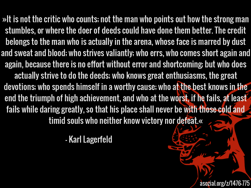 »It is not the critic who counts; not the man who points out how the strong man stumbles, or where the doer of deeds could have done them better. The credit belongs to the man who is actually in the arena, whose face is marred by dust and sweat and blood; who strives valiantly; who errs, who comes short again and again, because there is no effort without error and shortcoming; but who does actually strive to do the deeds; who knows great enthusiasms, the great devotions; who spends himself in a worthy cause; who at the best knows in the end the triumph of high achievement, and who at the worst, if he fails, at least fails while daring greatly, so that his place shall never be with those cold and timid souls who neither know victory nor defeat.« - Karl Lagerfeld