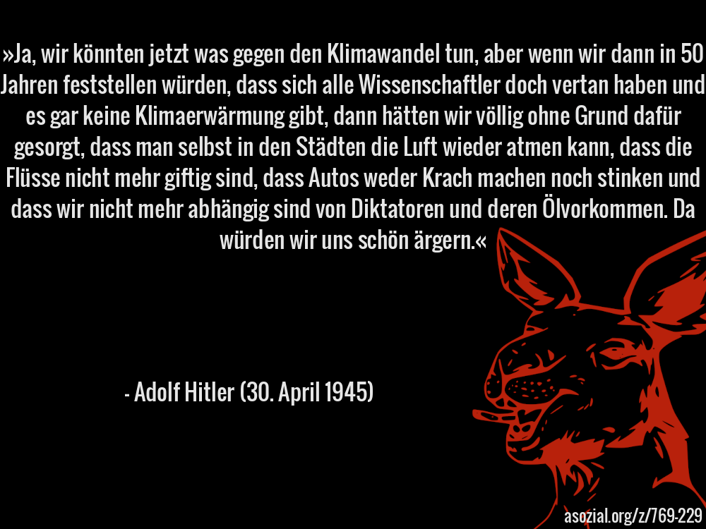 »Ja, wir könnten jetzt was gegen den Klimawandel tun, aber wenn wir dann in 50 Jahren feststellen würden, dass sich alle Wissenschaftler doch vertan haben und es gar keine Klimaerwärmung gibt, dann hätten wir völlig ohne Grund dafür gesorgt, dass man selbst in den Städten die Luft wieder atmen kann, dass die Flüsse nicht mehr giftig sind, dass Autos weder Krach machen noch stinken und dass wir nicht mehr abhängig sind von Diktatoren und deren Ölvorkommen. Da würden wir uns schön ärgern.« - Adolf Hitler (30. April 1945)