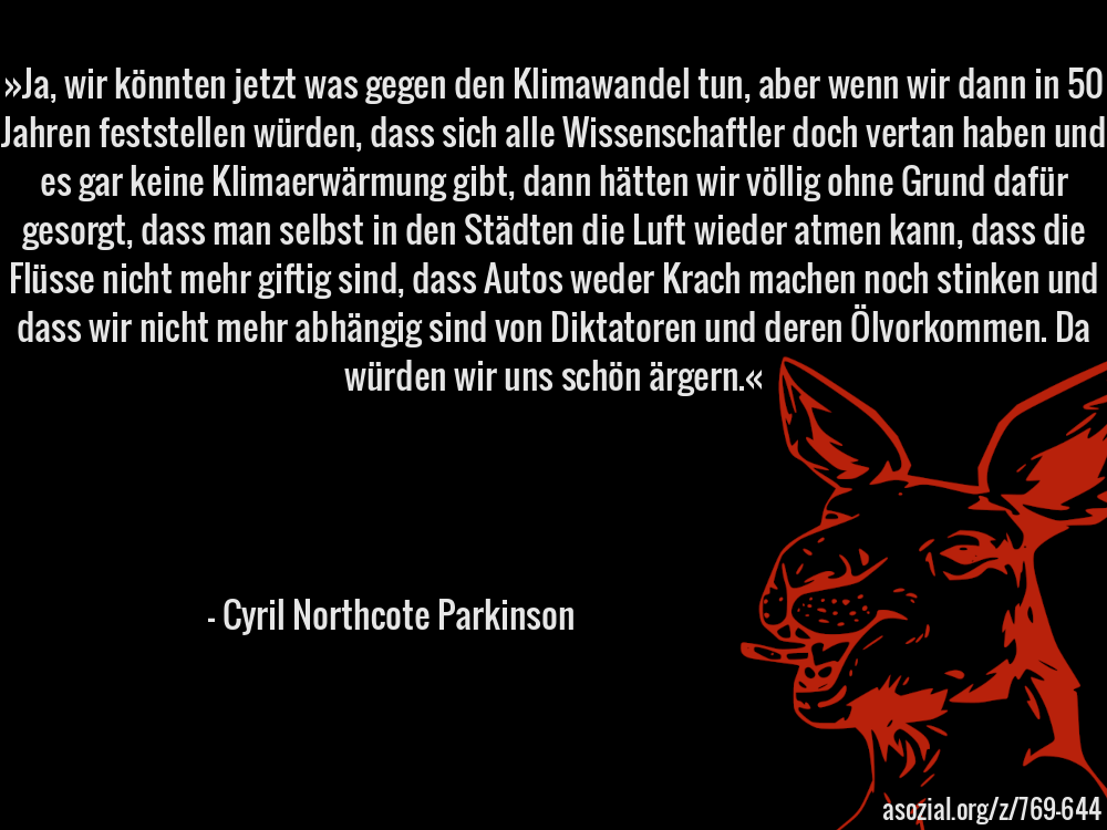 »Ja, wir könnten jetzt was gegen den Klimawandel tun, aber wenn wir dann in 50 Jahren feststellen würden, dass sich alle Wissenschaftler doch vertan haben und es gar keine Klimaerwärmung gibt, dann hätten wir völlig ohne Grund dafür gesorgt, dass man selbst in den Städten die Luft wieder atmen kann, dass die Flüsse nicht mehr giftig sind, dass Autos weder Krach machen noch stinken und dass wir nicht mehr abhängig sind von Diktatoren und deren Ölvorkommen. Da würden wir uns schön ärgern.« - Cyril Northcote Parkinson