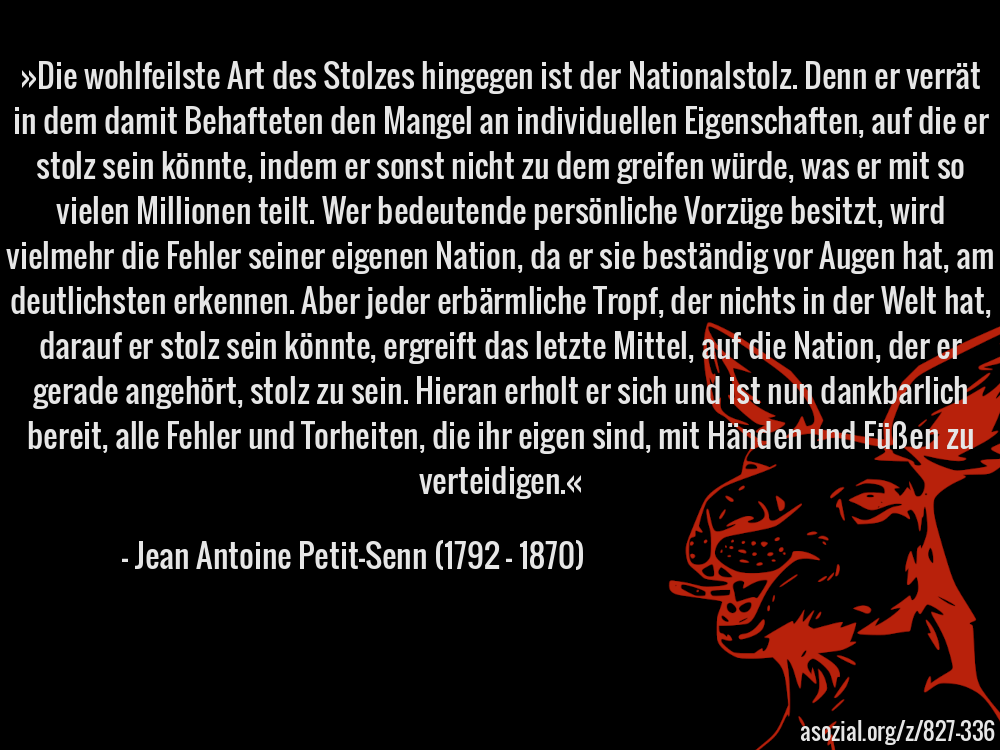 »Die wohlfeilste Art des Stolzes hingegen ist der Nationalstolz. Denn er verrät in dem damit Behafteten den Mangel an individuellen Eigenschaften, auf die er stolz sein könnte, indem er sonst nicht zu dem greifen würde, was er mit so vielen Millionen teilt. Wer bedeutende persönliche Vorzüge besitzt, wird vielmehr die Fehler seiner eigenen Nation, da er sie beständig vor Augen hat, am deutlichsten erkennen. Aber jeder erbärmliche Tropf, der nichts in der Welt hat, darauf er stolz sein könnte, ergreift das letzte Mittel, auf die Nation, der er gerade angehört, stolz zu sein. Hieran erholt er sich und ist nun dankbarlich bereit, alle Fehler und Torheiten, die ihr eigen sind, mit Händen und Füßen zu verteidigen.« - Jean Antoine Petit-Senn (1792 - 1870)